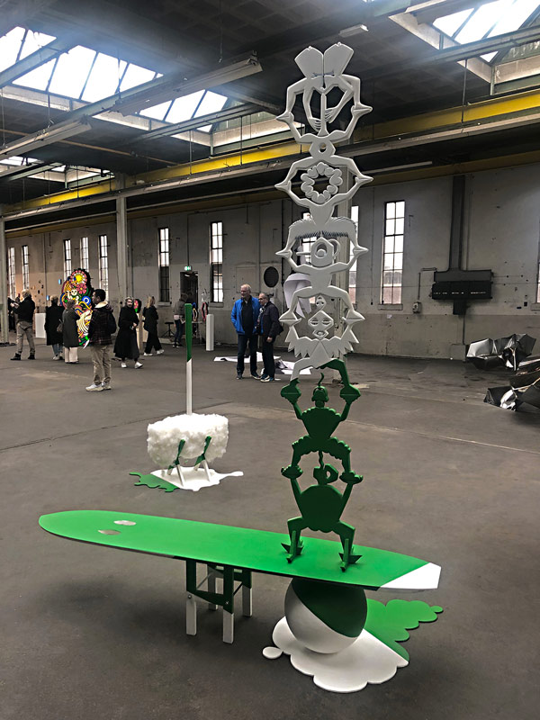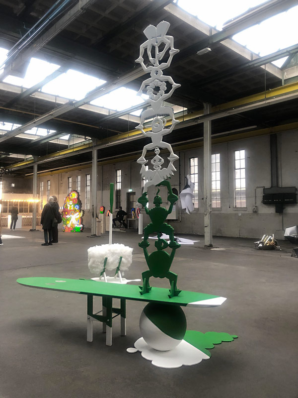 - Houten constructie bestaand uit 6 demontabele onderdelen. Mixed media: tekening op hout, houtzaag en snijwerk, dazzle painting.Wooden construction consisting of 6 detachable loose parts. Mixed media: Drawing, wood saw and carving, dazzle paint.